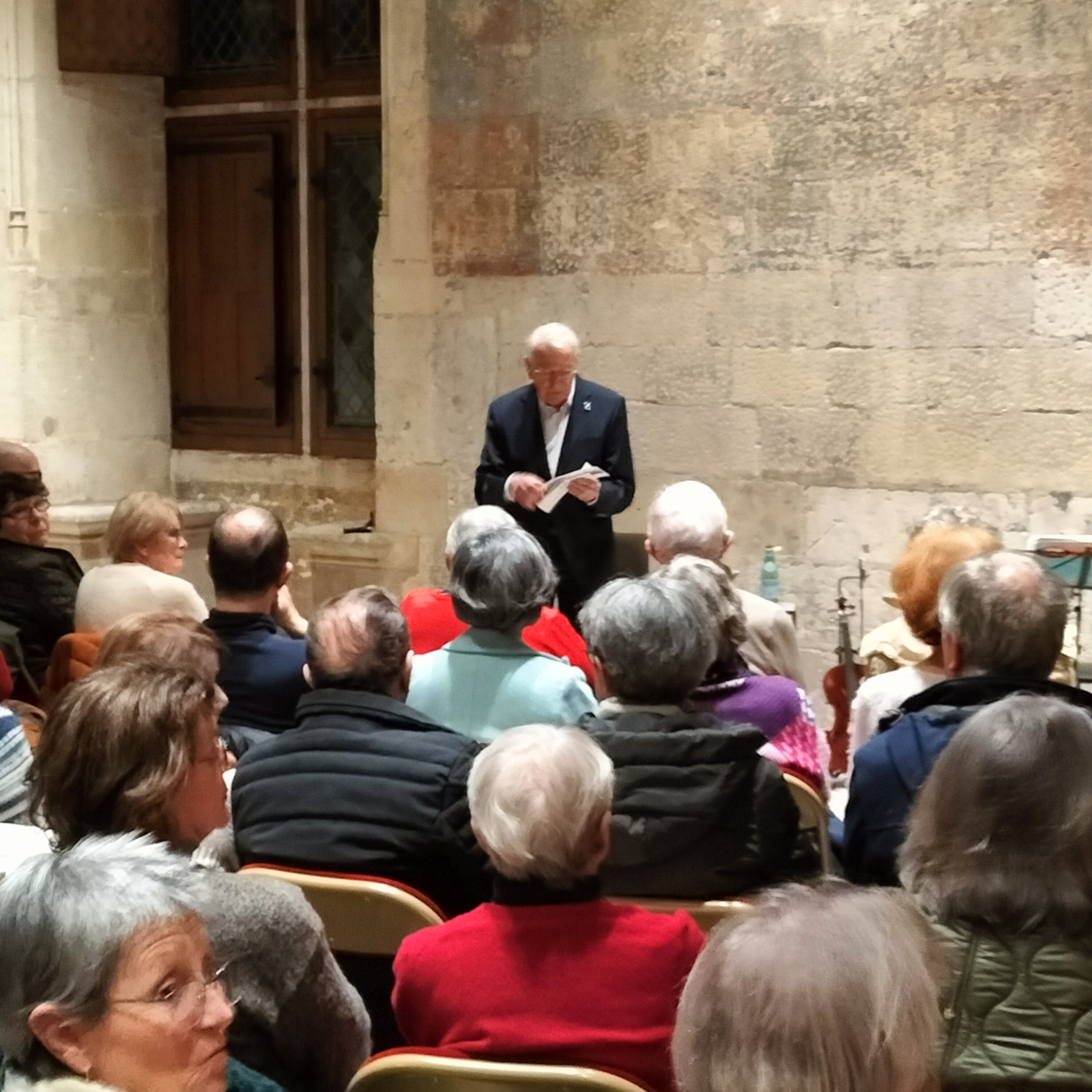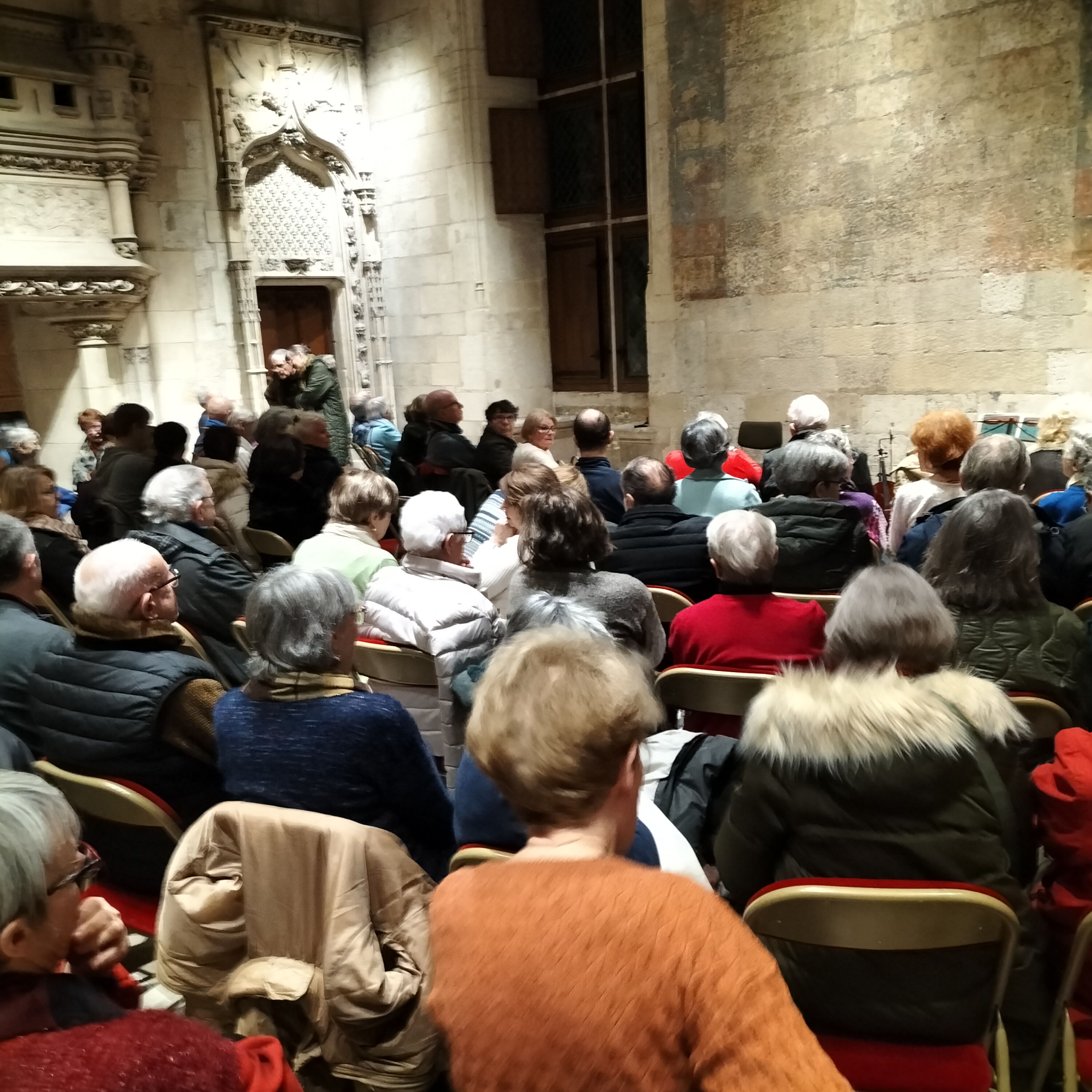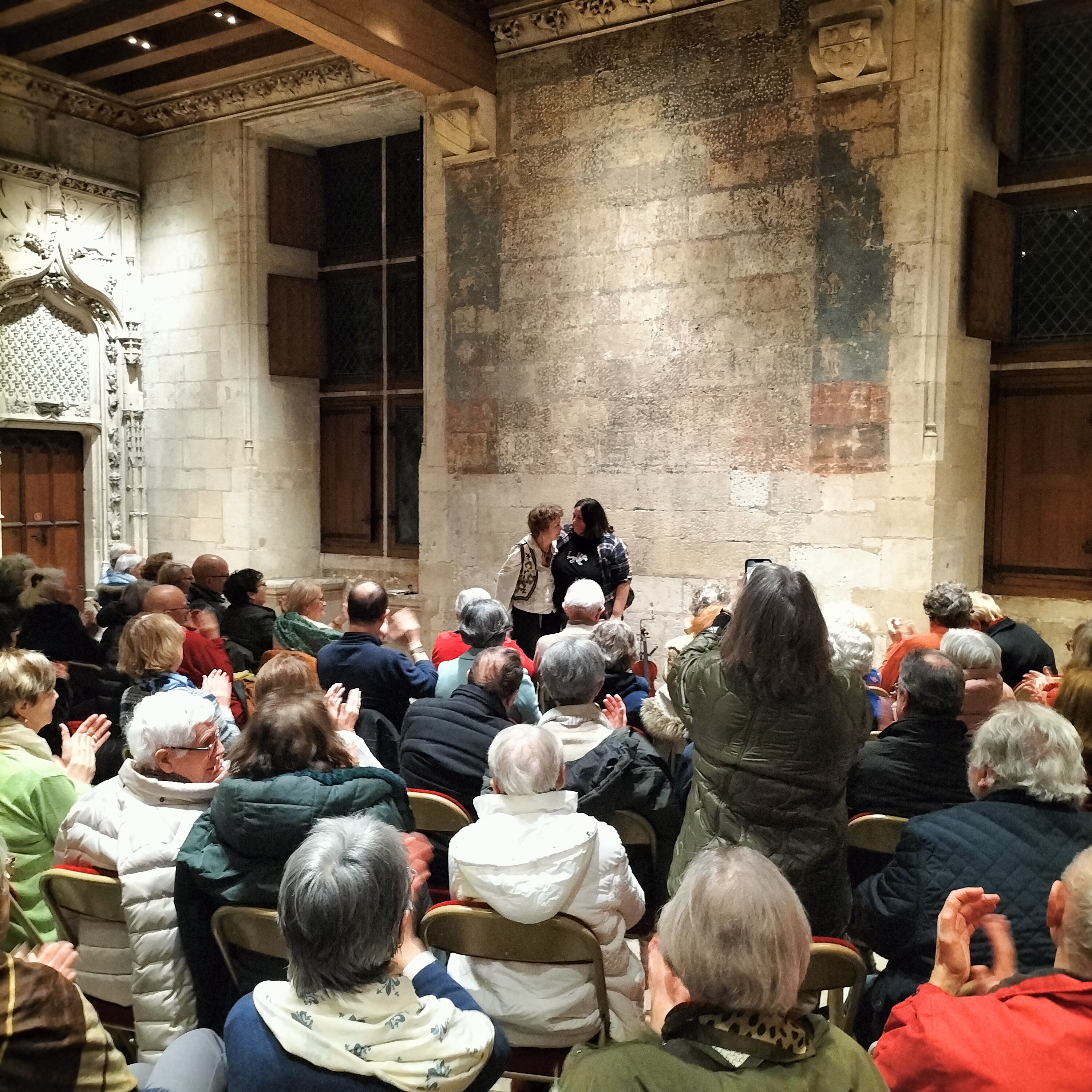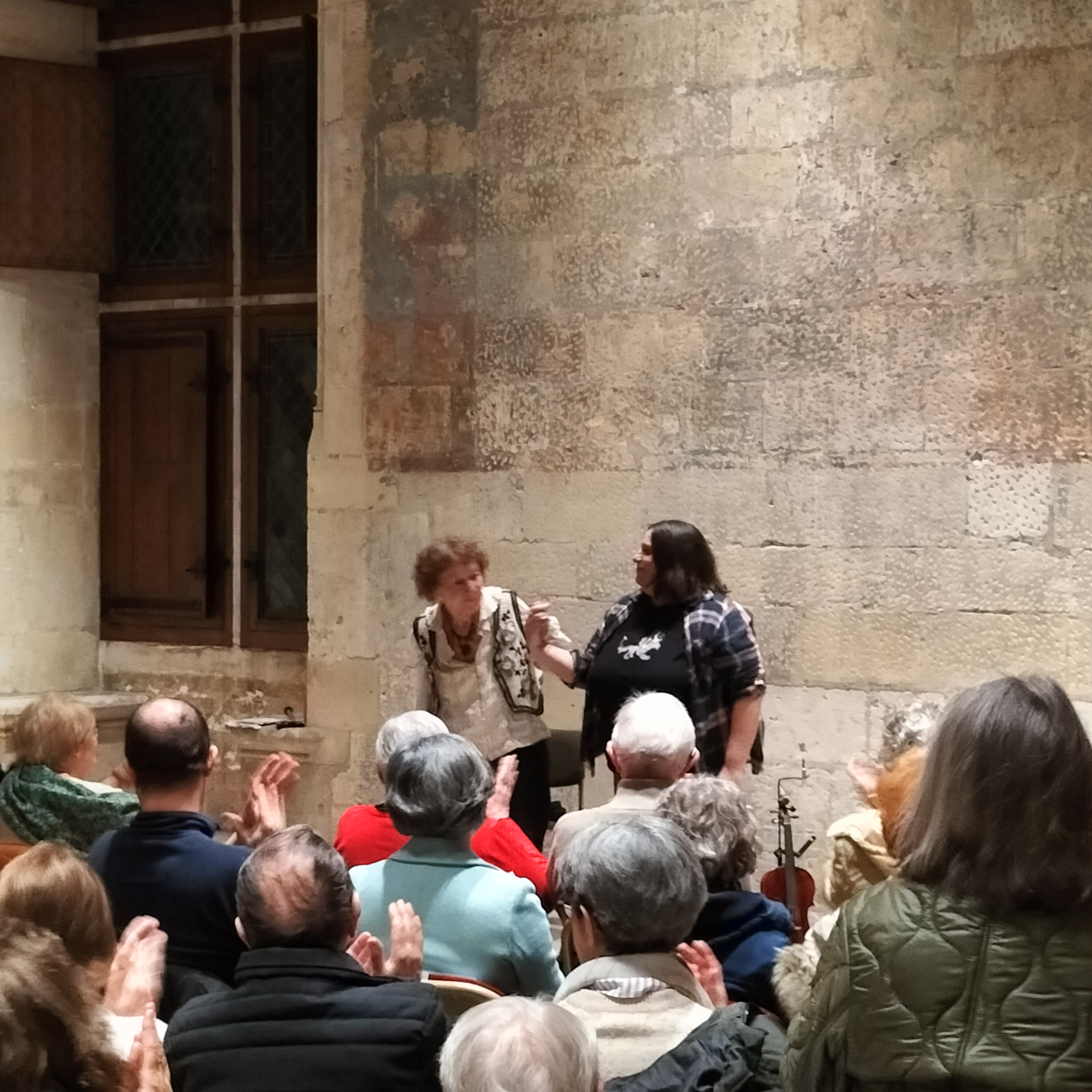 Entre deux éclats de rire, voilà ce qu’a pensé la foule du public réuni dans la salle de Festins du Palais Jacques-Cœur, ce jeudi 22janvier 2026. Oui, grâce aux talents conjugués de Michèle Perronnet et d’Anne-Marie Brot, le génie de Prévert s’est imposé magistralement. Conteuse hors pair, Michèle a su nous peindre les pérégrinations poétiques du dromadaire mécontent de n’avoir qu’une bosse, en passant par l’oiseau blessé dans la main du veilleur de nuit, tout en suivant l’affreux monsieur Edmond, sans oublier, bien sûr, l’évêque ivre qui veut rencontrer le pape au Vatican. Tout l’univers de Prévert était là. Avec des mots simples, des phrases du quotidien, Prévert a répandu ses vers dans une salle pleine et conquise. La ponctuation musicale était assurée par Anne-Marie Brot, une étonnante multi-instrumentiste qui sait passer avec un égal bonheur de l’accordéon au violon, puis de la clarinette aux percussions, avec de courtes interventions…du triangle ! La poésie quitte alors la bouche pour charmer l’oreille. Et la musique agit alors en contrepoint du verbe et s’impose en réel complément de la parole. Cette lecture musicale titrée « soyez polis !! », a su remettre en selle Prévert, bien injustement rejeté dans les limbes actuelle de la littérature, lui qui savait mieux que personne évoquer « le bruit de l’œuf dur sur le comptoir d’étain », bien avant les restos du cœur. Une superbe soirée conclue par le traditionnel partage de la galette offerte, en début d’année, par « Double Cœur » à son chaleureux public.